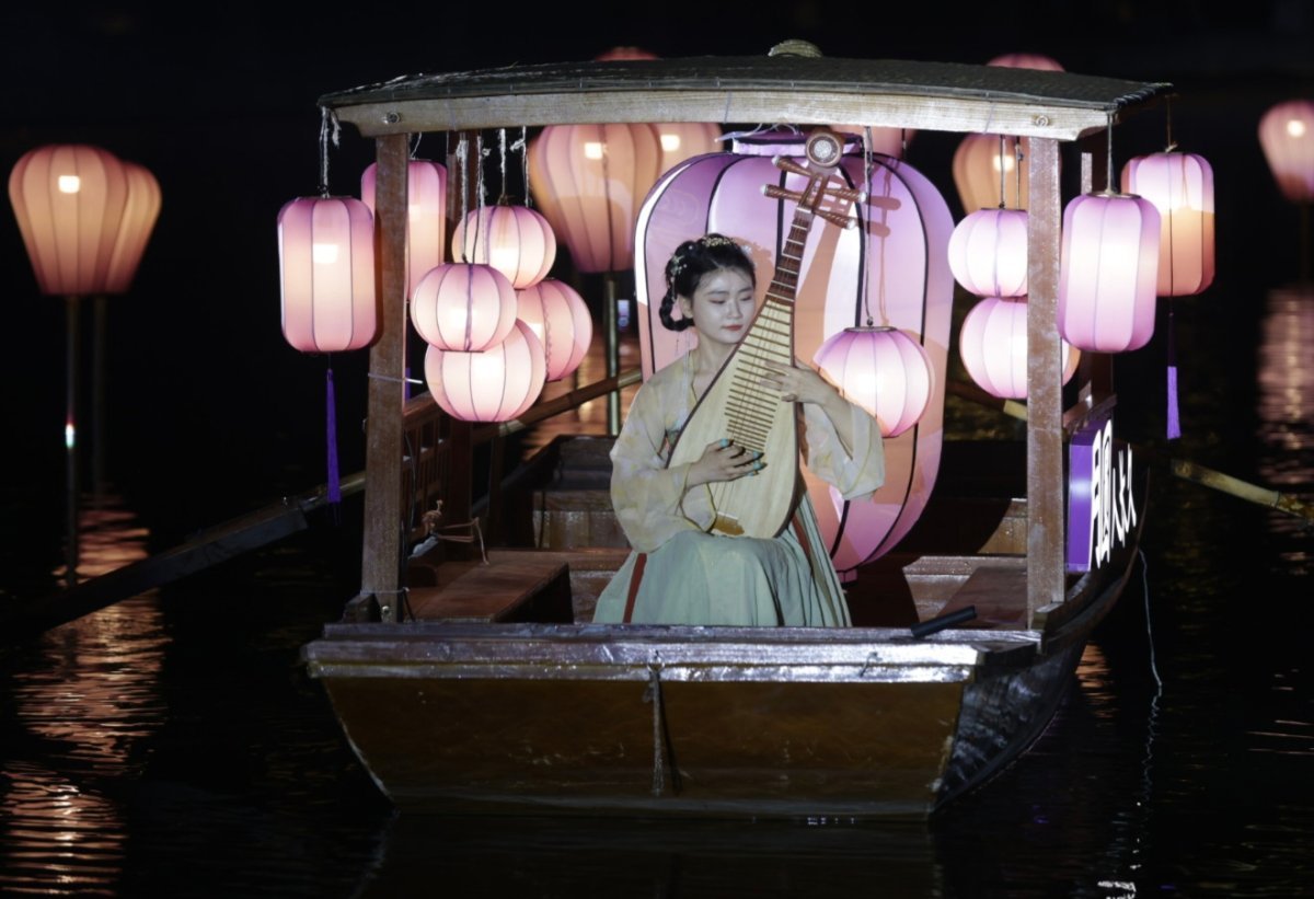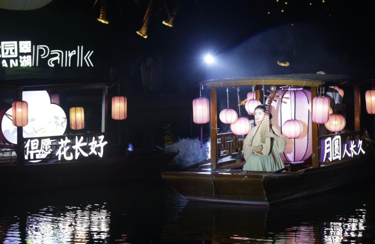 10月2日晚,夜色渐浓,珠海城市阳台中秋宫廷花灯会的百余盏宫廷花灯,在翠湖岸边骤然点亮。华灯初上时,暖黄、柔粉等各色灯光透过纱绢灯罩漫开,在湖面映出摇曳的光影。湖心上缓缓驶过一艘小船,琵琶演奏者在船上指尖轻拨,乐声伴灯影浮动。这片兼具古树、叠石、湖心亭的岭南特色水岸,瞬间化作古意盎然的“光影秘境”,引得市民游客纷纷驻足、打卡记录。