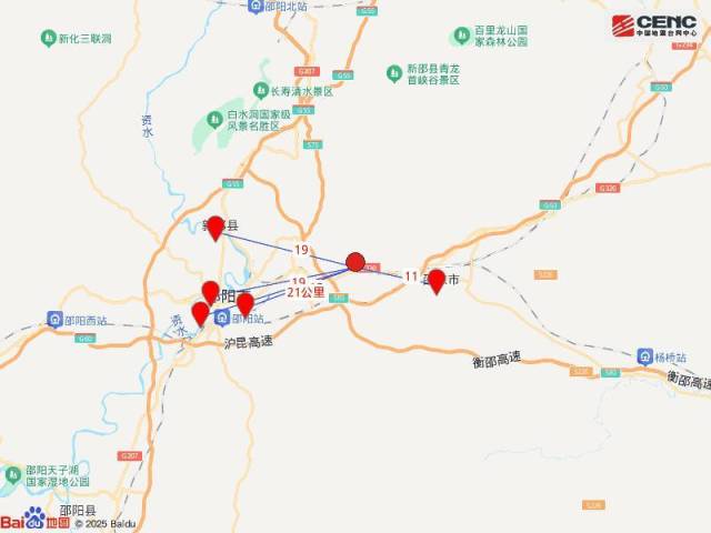 周边县城:震中距邵东市11公里、距双清区15公里、距北塔区19公里、距新邵县19公里、距大祥区21公里,距邵阳市18公里,距长沙市162公里。