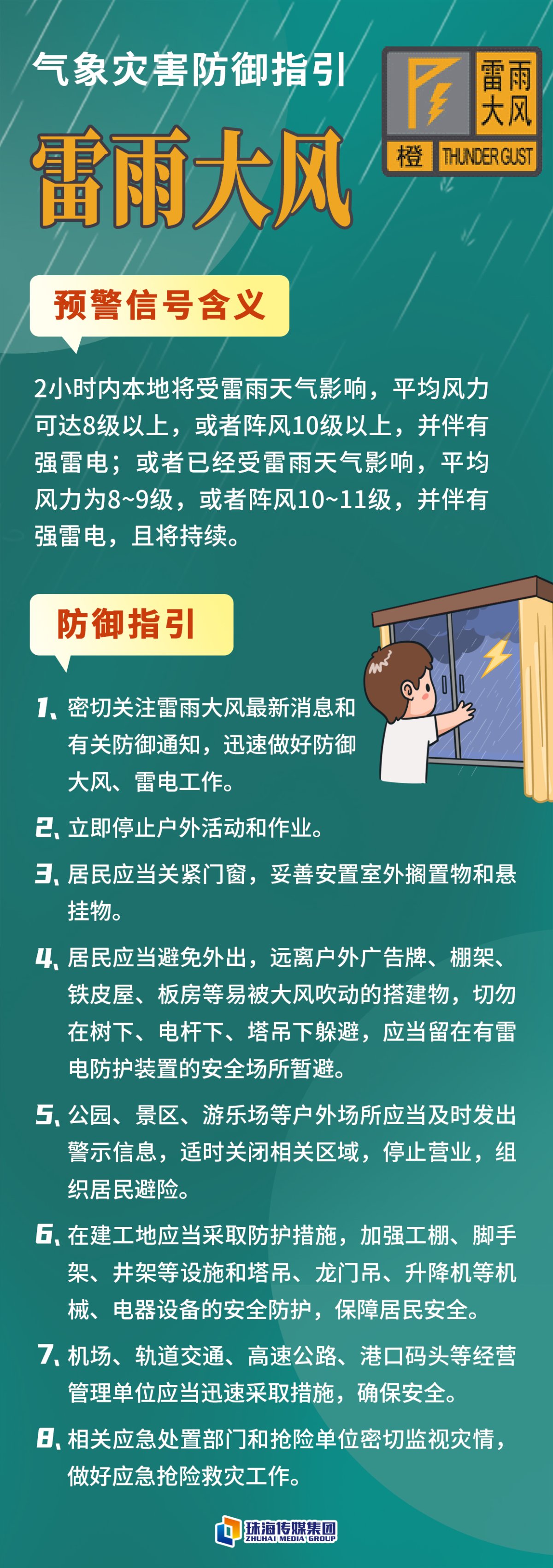 10月5日8时30分,珠海市气象台发布消息,目前强雷雨云团有所减弱,市气象台已将金湾区、经开区雷雨大风预警信号降级为橙色,其他区雷雨大风橙色和全市暴雨黄色预警信号继续生效,注意防御。