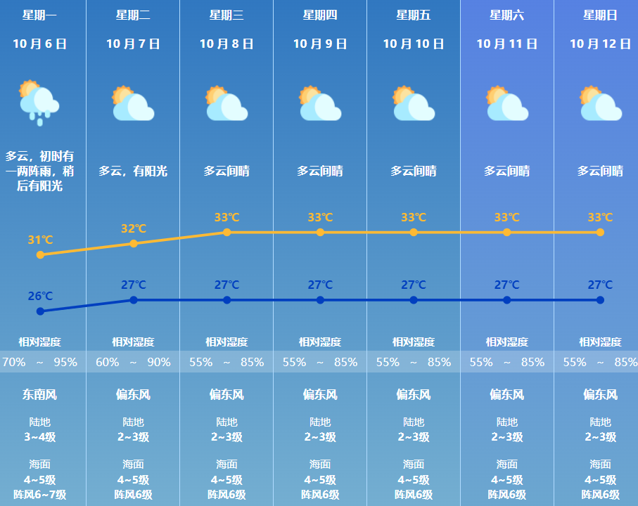 其中,6日(中秋节),湛江和茂名中雨转阵雨,其余市县多云有(雷)阵雨,夜间广东大部分市县可见月光。