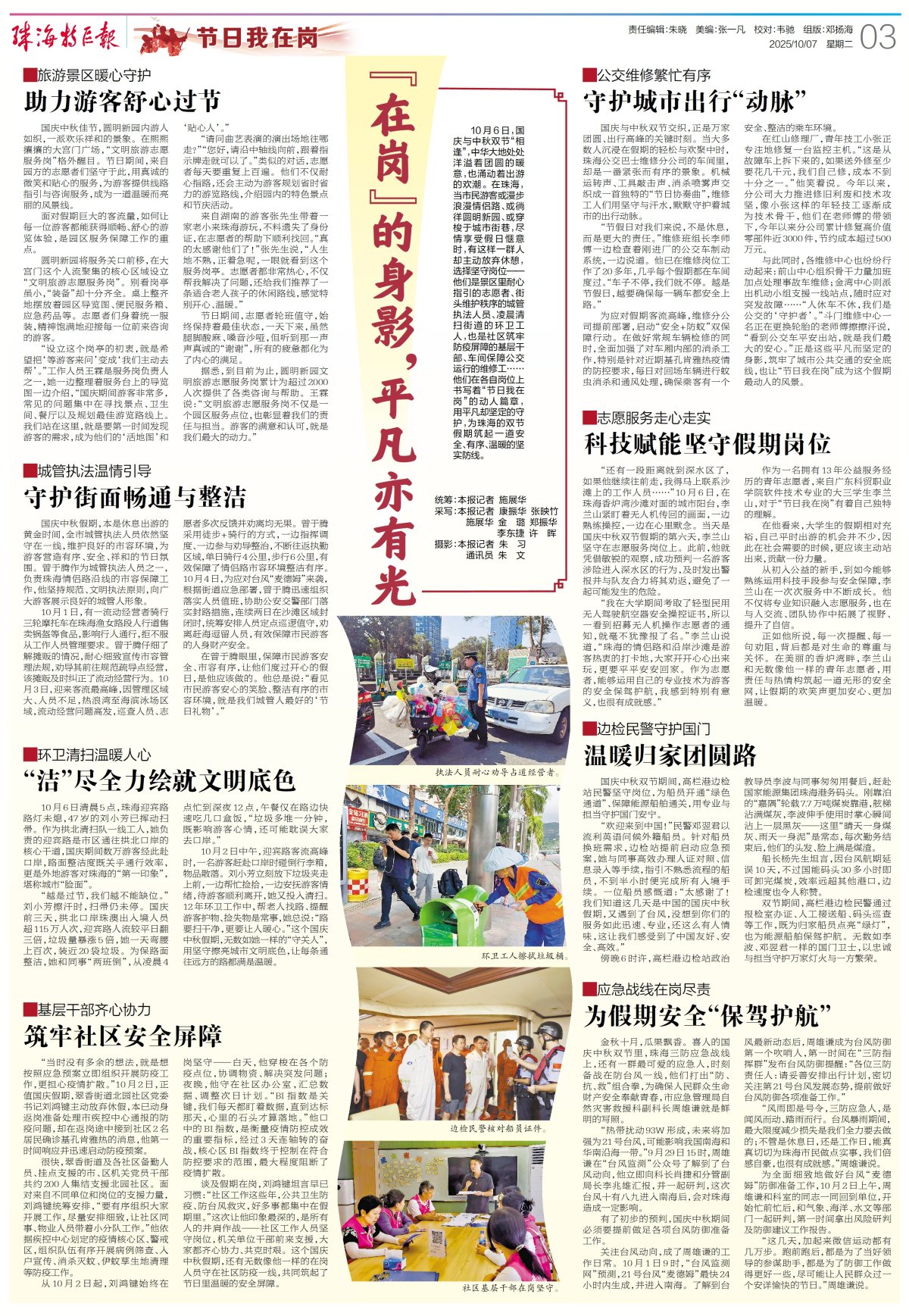 国庆中秋假期,本是休息出游的黄金时间,全市城管执法人员依然坚守在一线,维护良好的市容环境,为游客营造有序、安全、祥和的节日氛围。曾于腾作为城管执法人员之一,负责珠海情侣路沿线的市容保障工作,他坚持规范、文明执法原则,向广大游客展示良好的城管人形象。