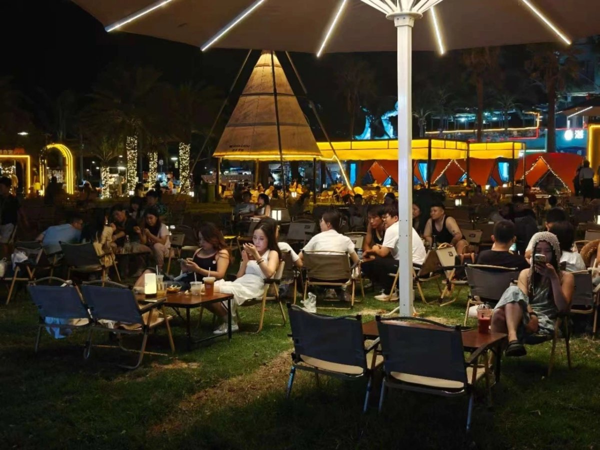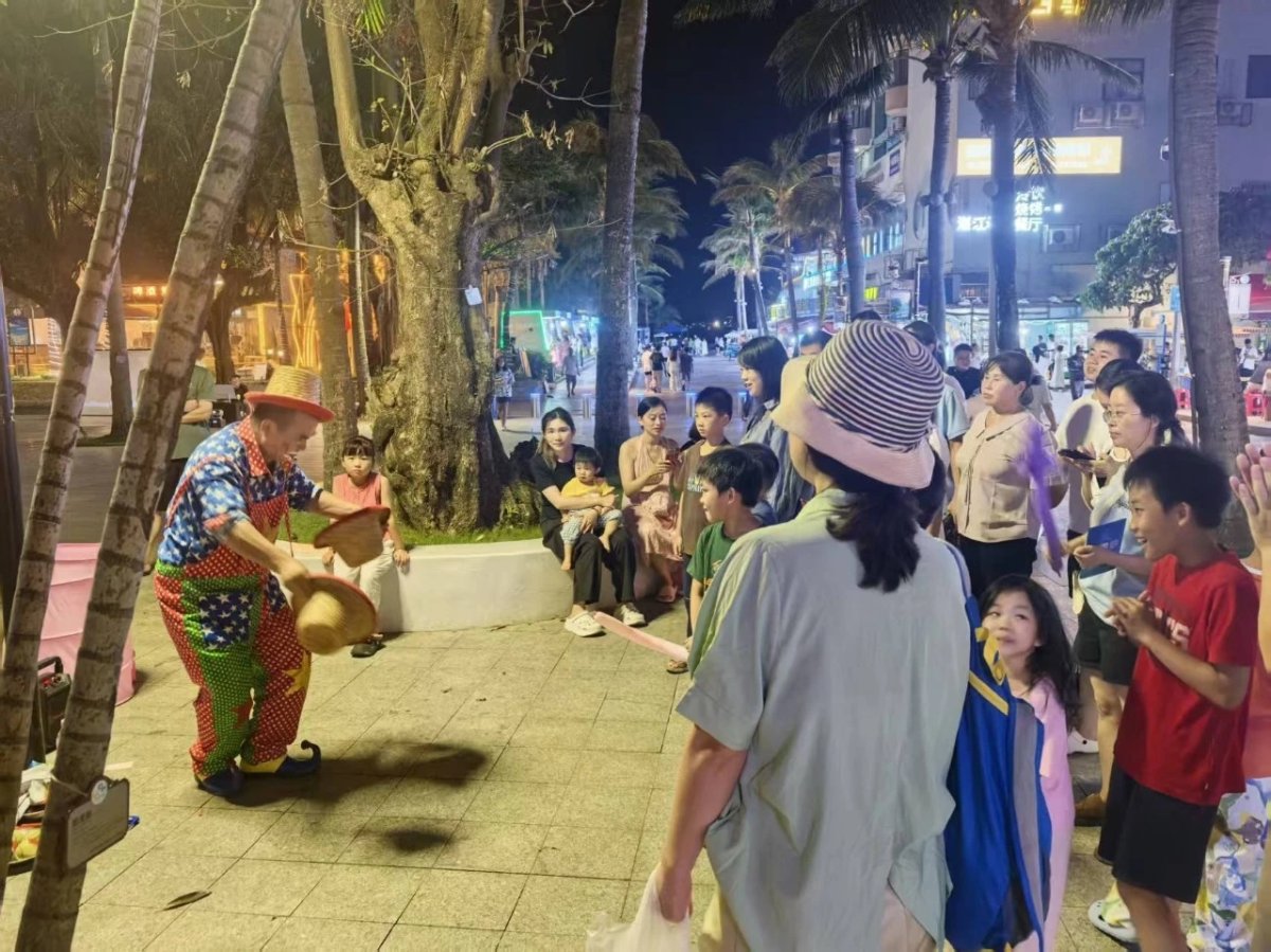 随着夜幕降临,外伶仃岛的夜晚依然充满活力。小丑表演者在天祥路与游客互动,孩子们手拿气球,笑声不断。慕茶营地的夜市音乐会吸引众多游客。现场灯光璀璨,歌声飘扬。营地负责人介绍,假期前两天,夜市音乐会均吸引300余人观演。