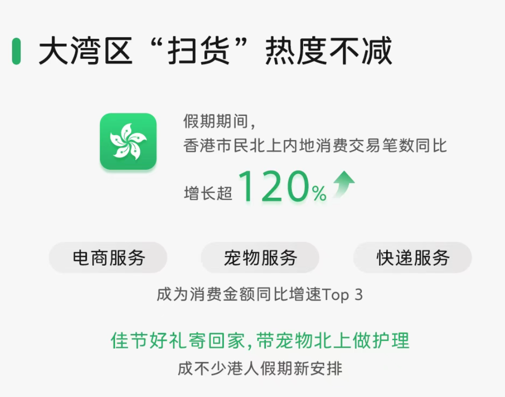 记者了解到,粤港澳大湾区不仅仅是最热门的旅游目的地,同时也是出游热度最高的地区。其中香港居民更是通过“拼假”北上过节。WeChat港币钱包数据显示,香港市民北上内地消费交易笔数同比增长超120%。港人线上线下扫货热度不减,电商服务、宠物服务、快递服务成消费金额同比增速Top3。此外,观看娱乐演出及赛事成十一期间香港市民北上休闲娱乐消费增速最快的项目。