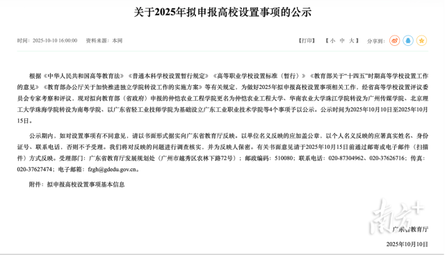 10月10日,广东省教育厅公示,仲恺农业工程学院拟更名为仲恺农业工程大学。公示时间为2025年10月10日至2025年10月15日。这意味着,仲恺农业工程学院“改大”有了新进展。