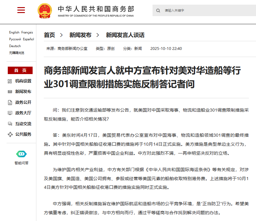 中方强调,相关反制措施旨在维护国际航运和造船市场的公平竞争环境,是“正当防卫”行为。希望美方慎重考虑,纠正错误做法,与中方相向而行,通过平等磋商与合作找到解决问题的办法。