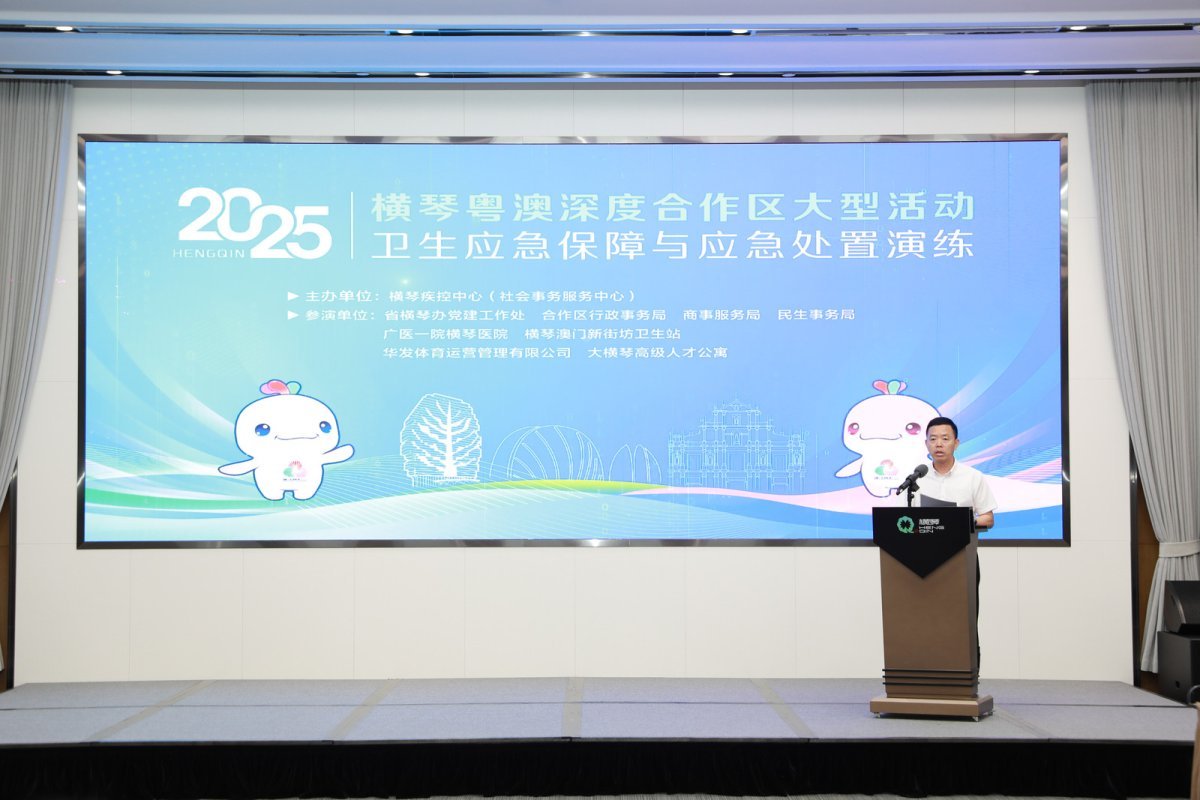 此次合作区大型活动卫生应急保障与应急处置演练由横琴疾控中心(社会事务服务中心)主办,省委横琴工委委员、省横琴办副主任叶真任总指挥长,围绕“实战检验预案、磨合联动机制、提升处置能力”目标,以十五运会和残特奥会网球赛事保障为背景,模拟“诺如病毒感染暴发”,通过“现场录播+桌面推演”的形式,开展风险防控、疫情发现与报告、现场处置与联防联控、终止响应四个科目的全流程演练,珠海市卫生健康局、珠海市疾病预防控制中心、澳门卫生局疾病预防与控制中心及合作区相关单位参加演练活动。