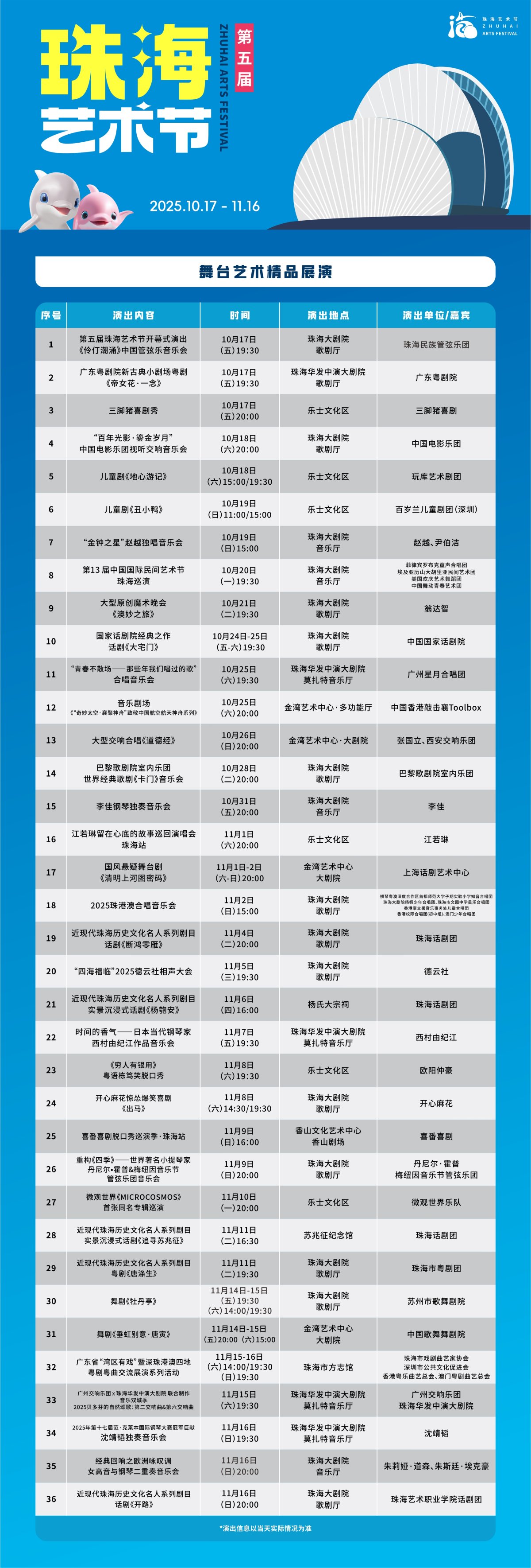 第五届珠海艺术节将以高水平的艺术呈现、广覆盖的惠民政策、深融合的区域联动,打造一场“人人可参与 处处有艺术”的城市文化盛宴,它不仅是珠海文化建设成果的集中展示,也是城市软实力与人文温度的生动体现。10月17日,“艺”触即发,“艺”起共赴!