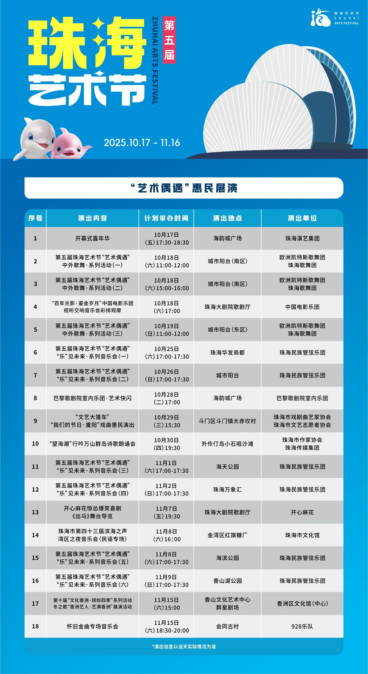 第五届珠海艺术节将于10月17日启幕,本届珠海艺术节以舞台艺术为核心,精心打造舞台艺术精品展演、主题艺术展览、珠港澳文艺展演、“艺术偶遇”惠民展演、经典电影展映、“对话艺术”文艺沙龙等六大核心板块,汇聚国内外顶尖院团与艺术家,呈现近百场精彩活动。值得一提的是,艺术节不仅精品云集,更以诚意满满的惠民力度,彰显“艺术的盛会,市民的节日”这一办节理念。
