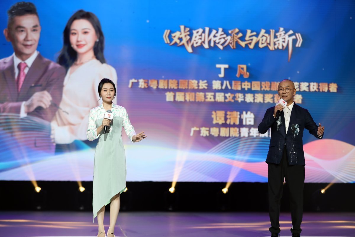 随着舞台灯光转暗,一束光打在第八届中国戏剧梅花奖、首届和第五届文华表演奖获得者丁凡与广东粤剧院青年演员谭清怡身上。师徒二人以精彩的粤剧对唱开场,在《戏剧传承与创新》宣讲中,他们深情讲述了粤剧艺术的传承与创新之路,在坚守传统根脉的同时,大胆融入时代元素,使粤剧既保留古典韵味,又焕发时代新彩。