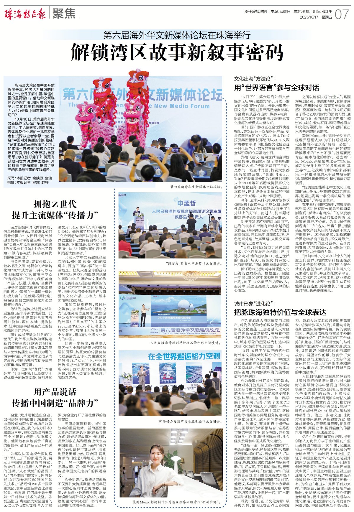 10月16日,第六届海外华文新媒体论坛在广东珠海隆重举行。主论坛环节,来自学界、媒体界及企业界的一批专家学者和资深从业者会聚一堂,围绕“中国对外传播的创新路径”“企业出海的品牌叙事”“Z世代的传播生态构建”等核心议题展开深度探讨,分享智慧,激荡思想,为在新形势下如何更有效地向世界讲述中国故事、湾区故事与珠海故事,提供了多元的视角与宝贵的实践路径。