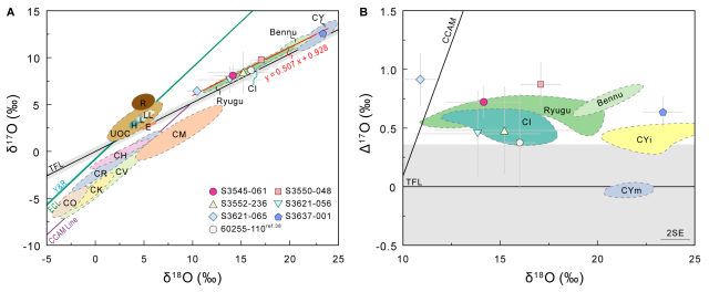 CI型陨石的母体小行星原本主要分布在外太阳系小行星带,自带水和有机质。这一发现证实了,外太阳系物质确实能飞进内太阳系。它也解释了月球上部分水的来源——那些带着正氧同位素特征的水,很可能就是这些陨石撞上去时留下的。