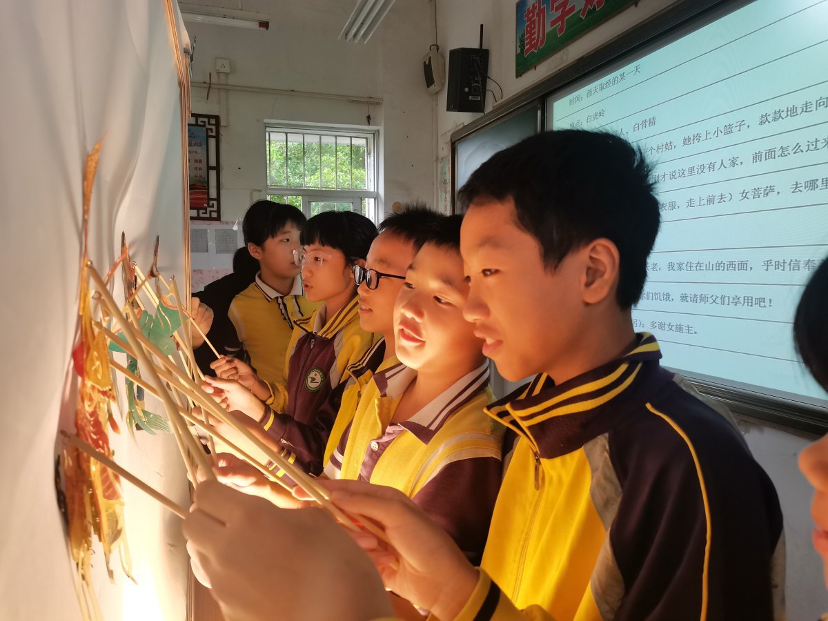 活动设置声乐、古典舞、国画、漆扇、陶艺、皮影戏等特色课程,覆盖了白蕉镇竹洲小学全校三至六年级共141名学生。其中,国画项目备受关注,师生们围绕竹洲小学的竹文化,以竹子和麻雀为创作主题,一方精心勾勒竹子的挺拔姿态,一方细致描绘麻雀的灵动模样,默契配合下,共同完成了一幅精美的国画卷轴。此外,孩子们在老师的带领下,沉浸式体验国画笔墨、漆艺匠心、陶艺拉胚、皮影戏光影等非遗技艺与传统文化,于创作中专注探索,不仅收获了技能,更在心底萌发了对非遗和本土传统文化的热爱,让优秀传统文化的种子得以在少年儿童心中扎根。