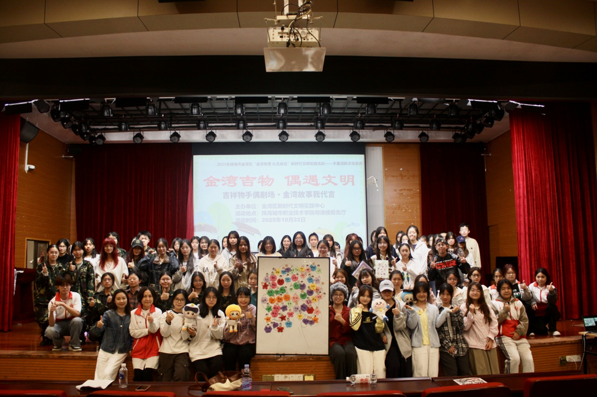 10月22日晚,珠海城市职业技术学院明德楼报告厅内欢声笑语、思潮涌动。一场别开生面的活动“金湾吉物·偶遇文明——吉祥物手偶剧场·金湾故事我代言”青年场在此举办。本次活动由金湾区新时代文明实践中心、中共金湾区委宣传部、金湾区精神文明建设办公室联合主办,近百名高校学子与年轻职场人齐聚一堂,在金湾文明吉祥物“4小只”的引领下,共同体验了一场指尖上的文明探索之旅。