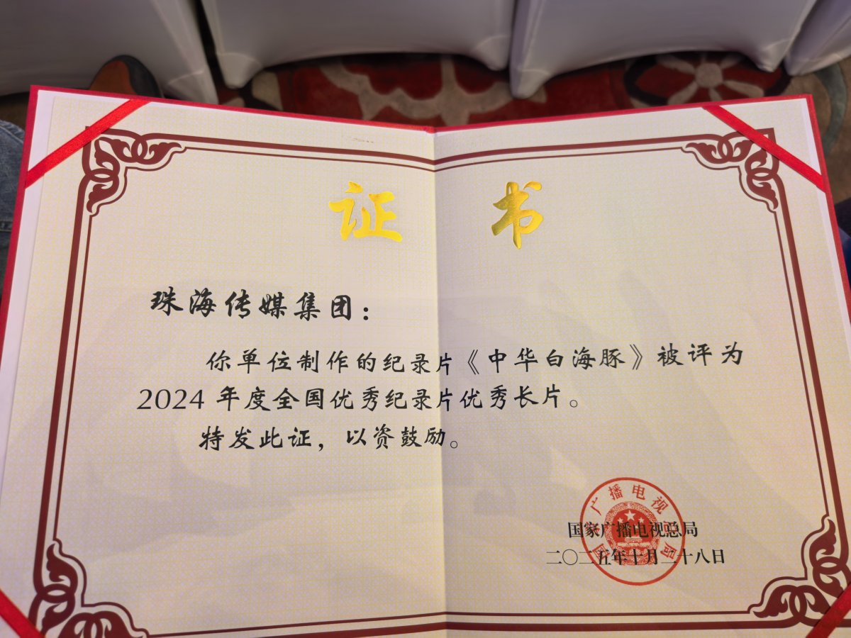 2025中国广播电视精品创作大会于10月28至29日在北京举办,由中央广播电视总台、广东广播电视台、珠海传媒集团联合摄制的电视纪录片《中华白海豚》入选“2024年度全国优秀纪录片”优秀长片。中华白海豚是2025年第十五届全国运动会和残特奥会的吉祥物原型,在本届运动会期间,由电视纪录片原班人马打造的纪录电影将登陆全国院线。