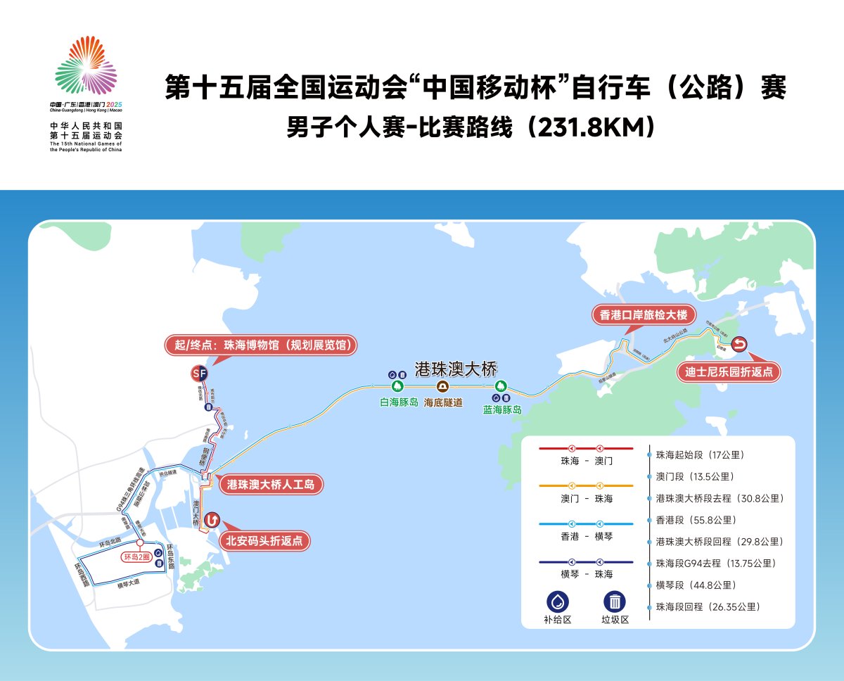 十五运会自行车(公路)赛男子个人赛是本届全运会唯一粤港澳三地融合进行的比赛项目,也是全运会史上赛道最长的自行车公路赛事。这条以港珠澳大桥为纽带的赛道,串联香港、澳门、珠海及横琴粤澳深度合作区的城市道路,全程231.8公里,其中香港段55.8公里,澳门段13.5公里,珠海段117.7公里,横琴段44.8公里。