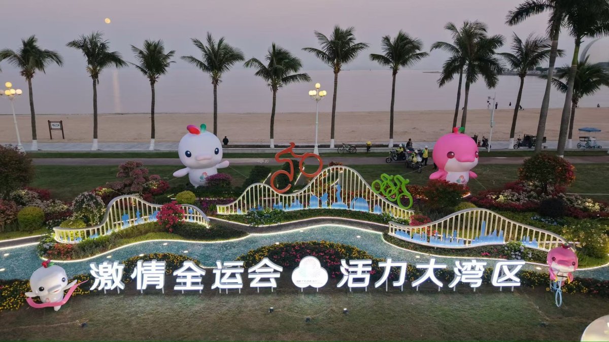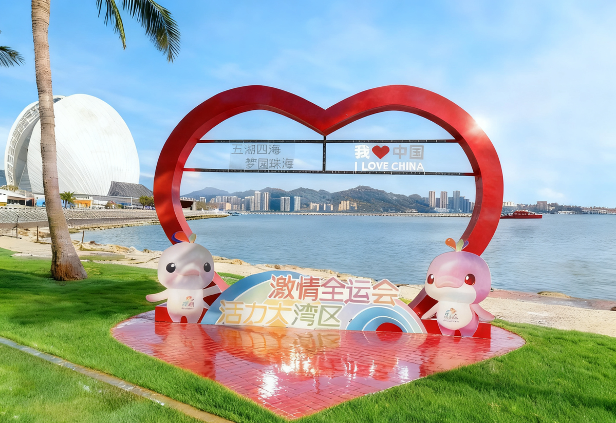 为营造“激情全运会·活力大湾区”的浓厚氛围,珠海市属公园精心打造了四处主题景观景点。其中,位于珠海市博物馆对面、十五运会自行车比赛起点处的大型景观尤为引人注目。