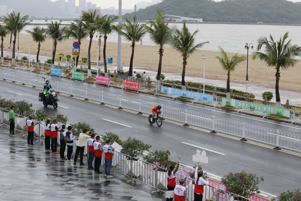 11月7日上午,珠海情侣路畔,“渔女”雕像静静伫立,第十五届全运会自行车计时赛在淅沥雨水中激烈展开。来自四川的杨女士与家人自驾游途经珠海,意外与这场高水平赛事相遇,也成为珠海城市风貌与体育氛围的见证者。