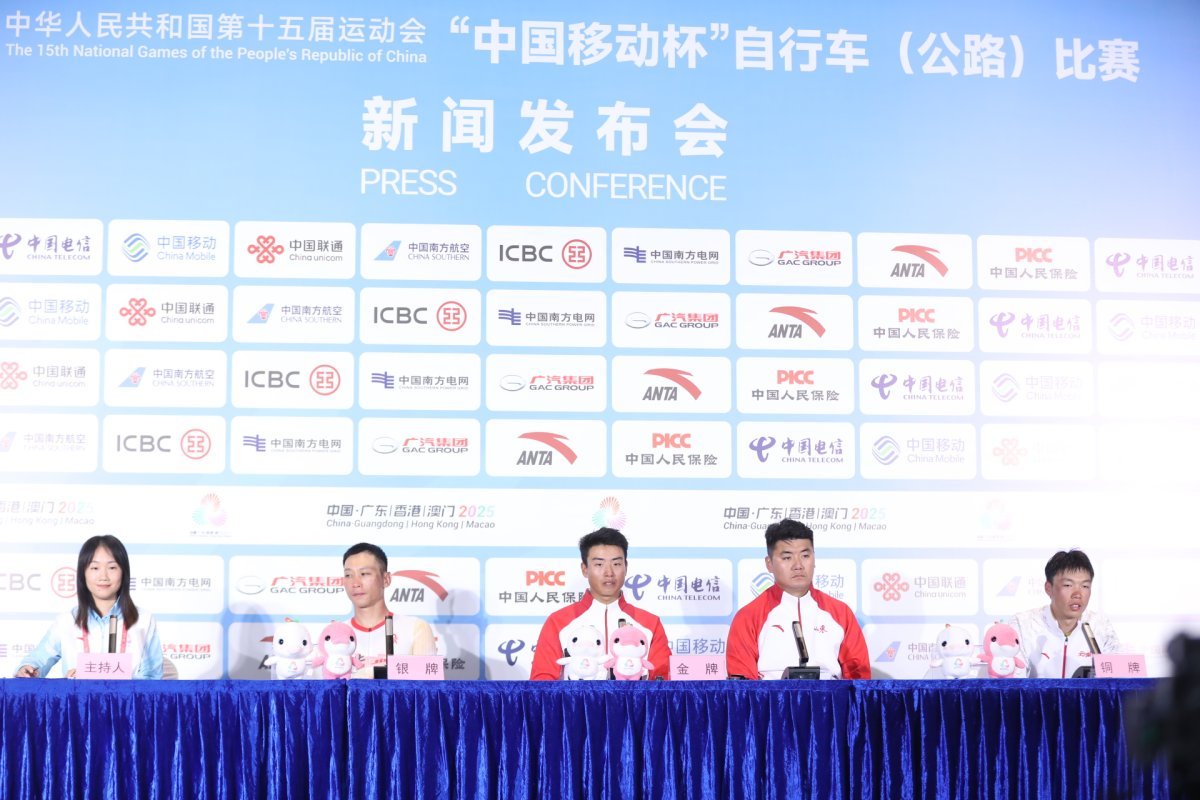 11月8日,十五运会自行车(公路)比赛男子个人赛新闻发布会举行。本次男子个人赛是第十五届全运会唯一一项跨境赛事,也是全运会历史上首次联通粤港澳三地的标志性项目。在历时五个多小时的激烈角逐后,山东队选手刘志城夺得金牌,北京队选手薛超华、云南队胡海杰分获银牌和铜牌。获奖运动员及教练代表出席发布会,分享赛事体验。