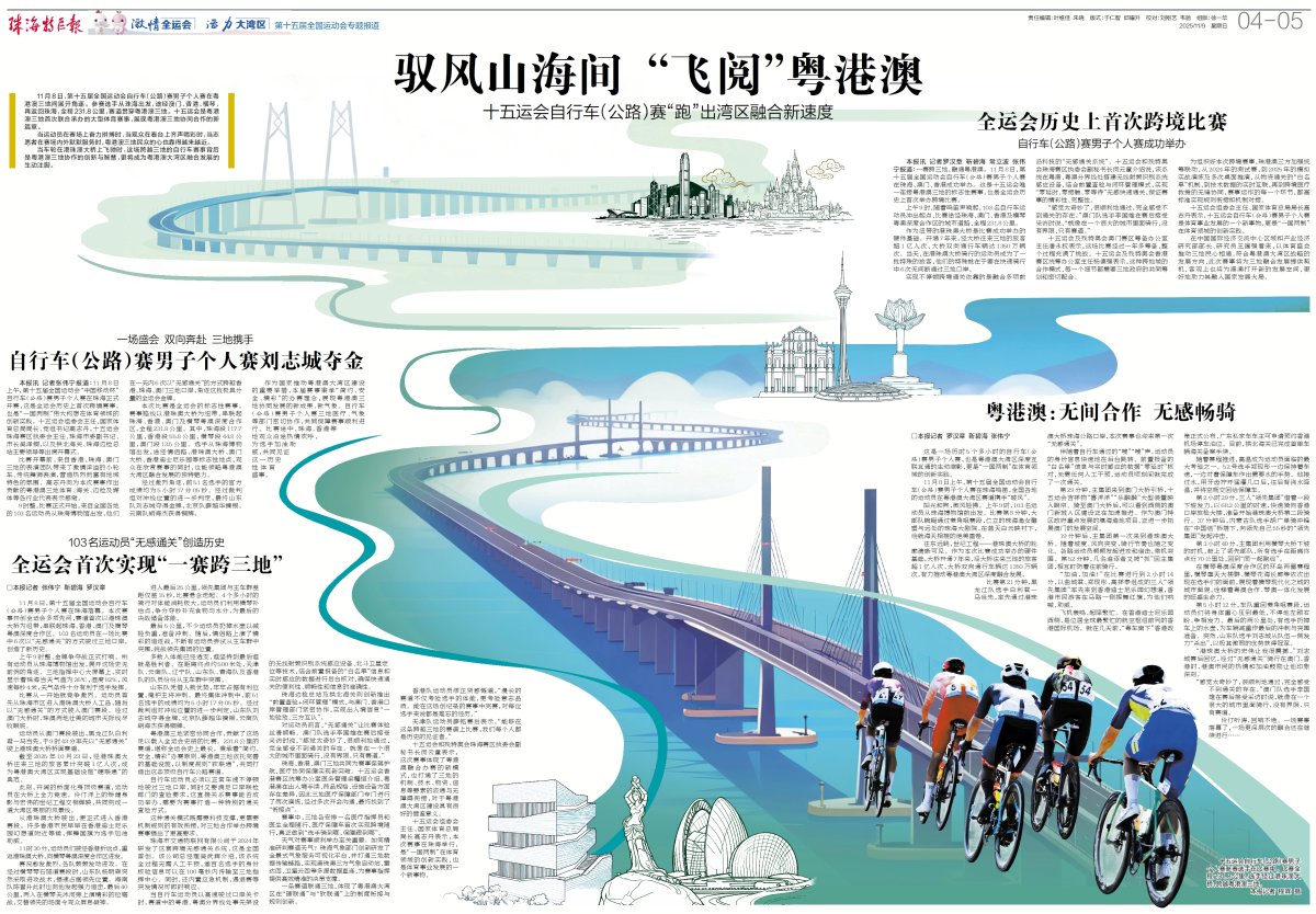 一赛跨三地,融通粤港澳。11月8日,第十五届全国运动会自行车(公路)赛男子个人赛在珠海、澳门、香港成功举办。这是十五运会唯一连接粤港澳三地的标志性赛事,也是全运会历史上首次举办跨境比赛。