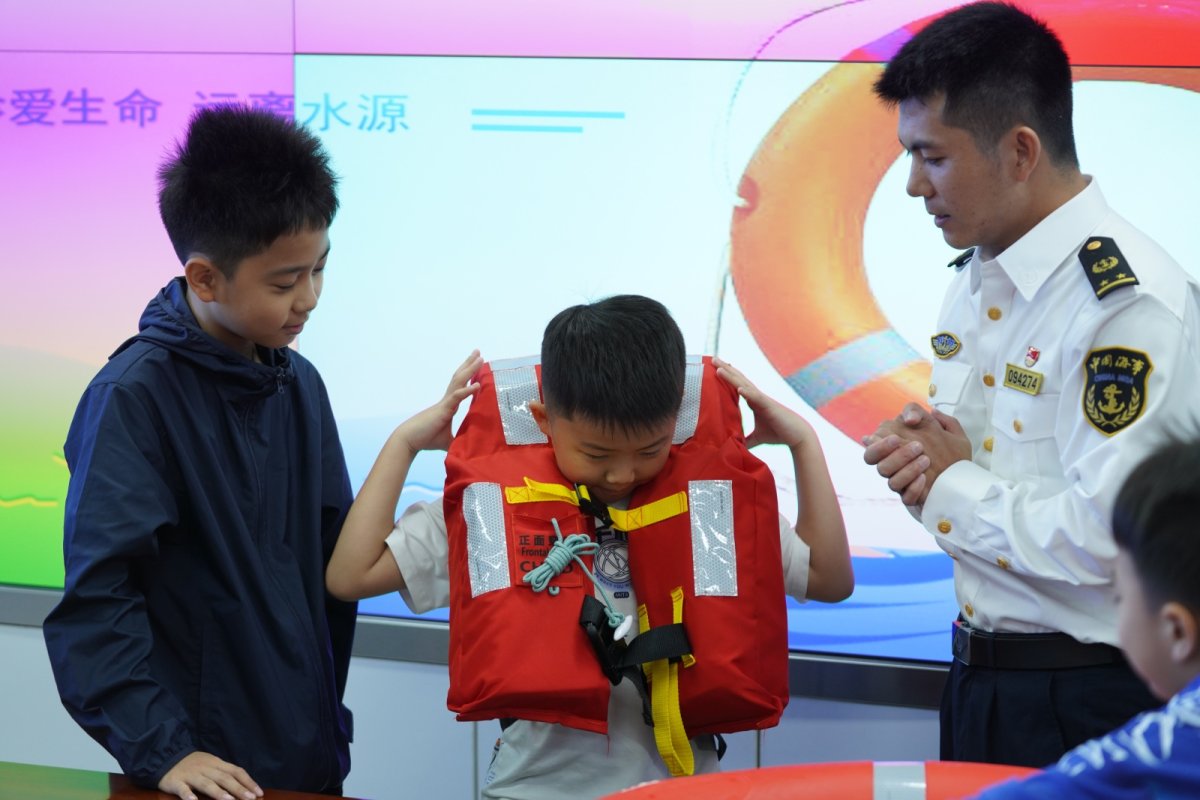 “穿救生衣时要将救生衣领口和腰间的卡扣系紧,使救生衣贴合身体,遇到危险时可以通过哨声发声定位求救……”在“水上校巴”体验环节,海事志愿者手把手指导参与者穿戴救生设备,帮助他们掌握“哨声定位”“浮力保持”等求生技能。“今天我学习了防溺水五步法以及自救互救技巧等实用知识,感觉受益匪浅!”一名刚完成实操的孩子激动地表示。