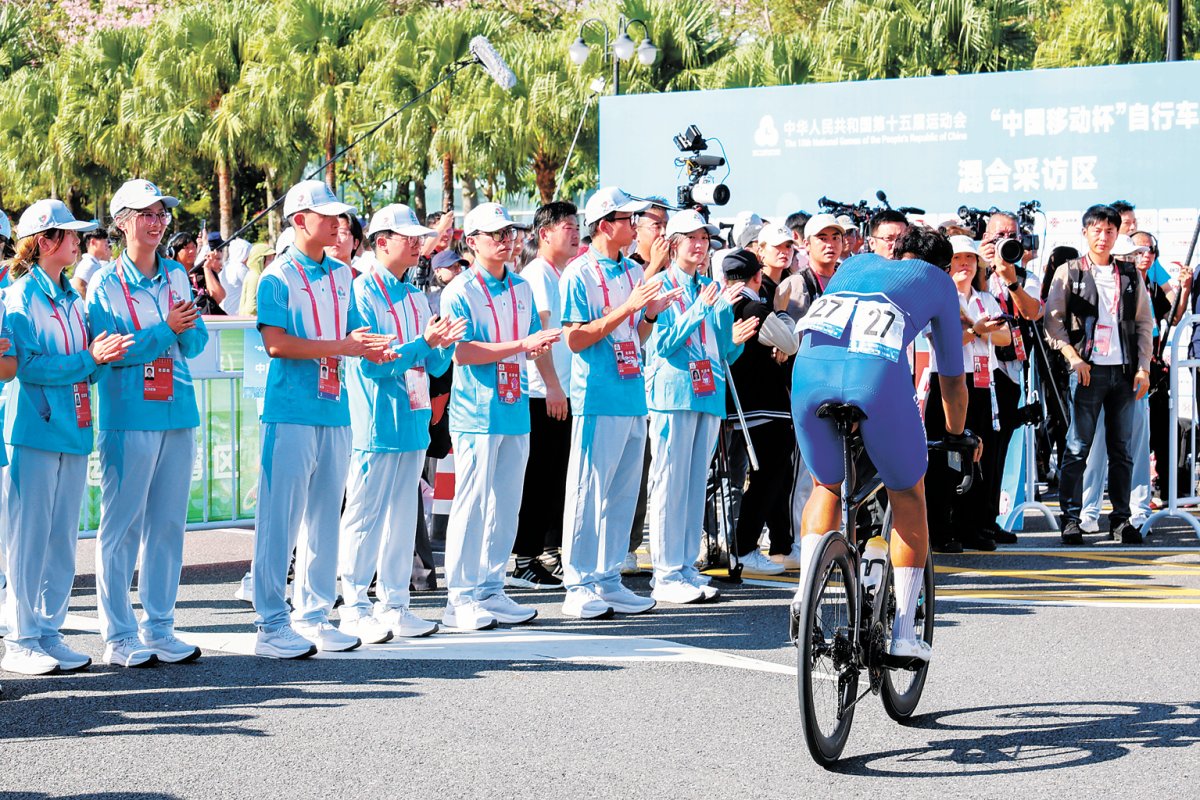 情侣路上,比赛正酣。在赛场一角,北京理工大学(珠海)的志愿者王佳诺穿着厚重的十五运会和残特奥会吉祥物服装,与观众热情互动。