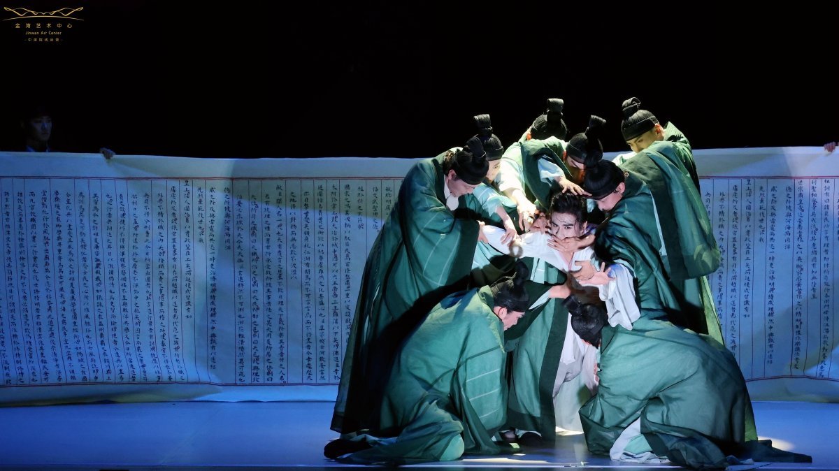 同样是文艺爱好者的中山大学学生杨记彬深有同感。“以往看剧,我几乎只去地理位置更近的珠海大剧院,今天却为这部剧第一次来到金湾。”他分享道,“《垂虹别意》舞美设计令人耳目一新,‘宣纸’作为视觉线索贯穿全场,既蕴含东方写意之美,又巧妙承担起叙事转场的功能,演员在其上滑行、翻滚的编排特别有创意。”