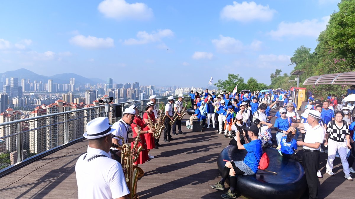 活动伊始,专业教练带领参与者开展热身运动,伸展、跳跃、扭腰等动作整齐有力,迅速点燃现场氛围。随着嘉宾鸣笛发令,参与者有序出发,踏上全长13.14公里的山海徒步路线。沿途近9公里的空中云道蜿蜒山间,串联起圆明新园仿古长城、澳门回归亭、板樟山森林公园、吉大水库等景点,一步一景间尽览山海城相融的独特风光。活动还设置了“520”“1314”两处主题打卡点及多个补水站,全程提供周到服务。