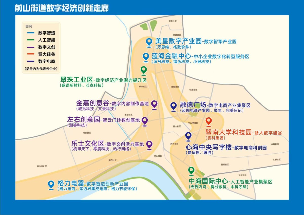 目前,前山街道着力打造的数字经济创新走廊,形成了以数字智造为主的美星数字产业园、蓝海金融中心,以人工智能为主的翠珠工业区、中海国际中心,以数字文创为主的金嘉创意谷、左右创意园、乐士文化区,以暨大硅谷为主的暨南大学科技园,以数字电商为主的融德广场、心海中央写字楼。