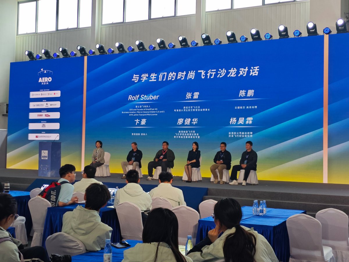 活动中,瑞士智飞创办人RolfStuber、退役空军飞行员张雷、云捷航空商务经理陈鹏、京佳通航创始人卞豪围绕不同的人生经历,分享与航空结缘的历程,并和台下观众交流答疑。卞豪介绍了自己考飞行执照到创业办航校的经历,解答了“如何选择航校”“近视是否可以获得飞行执照”等疑问。他在分享中提到,京佳设于珠海莲洲通用机场的培训基地,已有大批学员在此收获他们的独特飞行体验,引发台下观众对于珠海本地航空相关消费的兴趣,互动环节交流提问踊跃。