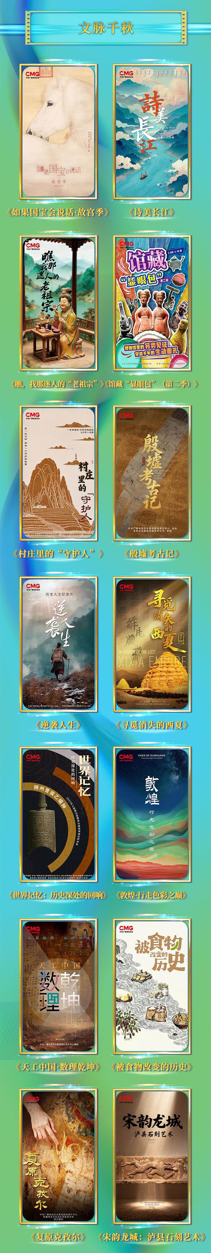 “文脉千秋”板块发布14部品质新作,探寻中华文明绵延密码、记录东方智慧的使命与担当。《如果国宝会说话·故宫季》展现故宫珍宝之美,让厚重历史再次鲜活;《诗美长江》以经典诗词解码长江生态之美、文明之韵与精神之魂;《瞧,我那迷人的“老祖宗”》在妆容服饰文物中探寻中华美学创造力;《馆藏“显眼包”(第二季)》用年轻化语言创新文物故事的传播方式。《复原克孜尔》《村庄里的“守护人”》《殷墟考古记》《逆袭人生》《寻觅消失的西夏》《世界记忆:历史深处的回响》《敦煌·行走色彩之巅》《天工中国·数理乾坤》《被食物改变的历史》《宋韵龙城:泸县石刻艺术》等作品照见文物守护者的质朴坚守,展现数理乾坤中的匠心智慧,追溯一段段绚烂而神秘的历史传奇,从多个角度与观众一同感知“何以中国”。