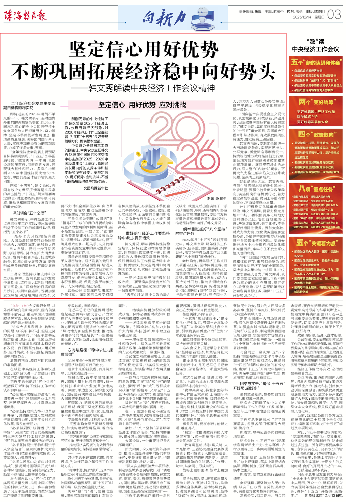 “明年我国经济发展面临的机遇和挑战并存,形势越是复杂,越要加强党对经济工作的全面领导,坚持党中央集中统一领导,形成统一意志和强大合力。”韩文秀说,我们要更加紧密团结在以习近平同志为核心的党中央周围,坚定信心、攻坚克难,奋力实现明年经济社会发展目标任务,确保“十五五”开好局、起好步。