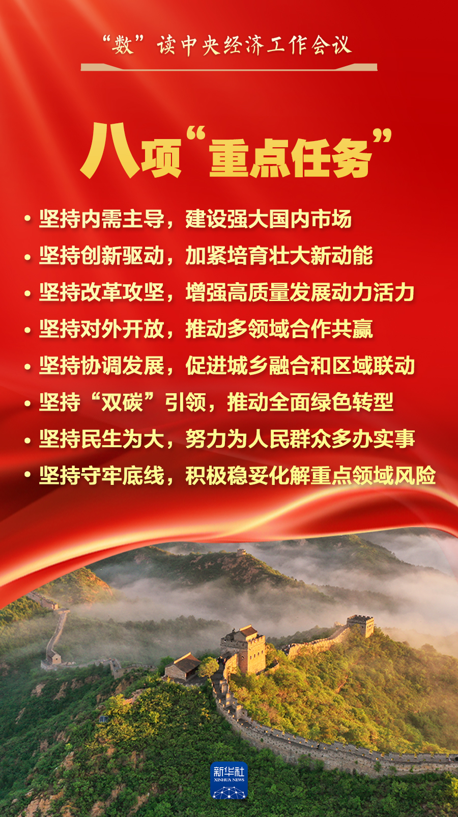 会议确定,明年经济工作抓好八项重点任务:坚持内需主导,建设强大国内市场;坚持创新驱动,加紧培育壮大新动能;坚持改革攻坚,增强高质量发展动力活力;坚持对外开放,推动多领域合作共赢;坚持协调发展,促进城乡融合和区域联动;坚持“双碳”引领,推动全面绿色转型;坚持民生为大,努力为人民群众多办实事;坚持守牢底线,积极稳妥化解重点领域风险。