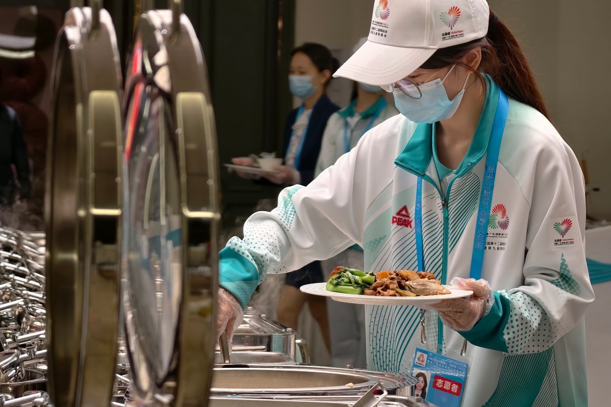 “这道是水煮肥牛,口味偏辣;旁边的是上汤菜心,清淡一些。”她熟练地用普通话向一位坐着轮椅的象棋选手介绍,随即俯身帮忙夹取。当对方用粤语道谢时,她眼睛一亮,自然地切换成粤语回应:“唔使客气,慢慢食。”口罩上方,她笑弯的眼睛像两道月牙。
