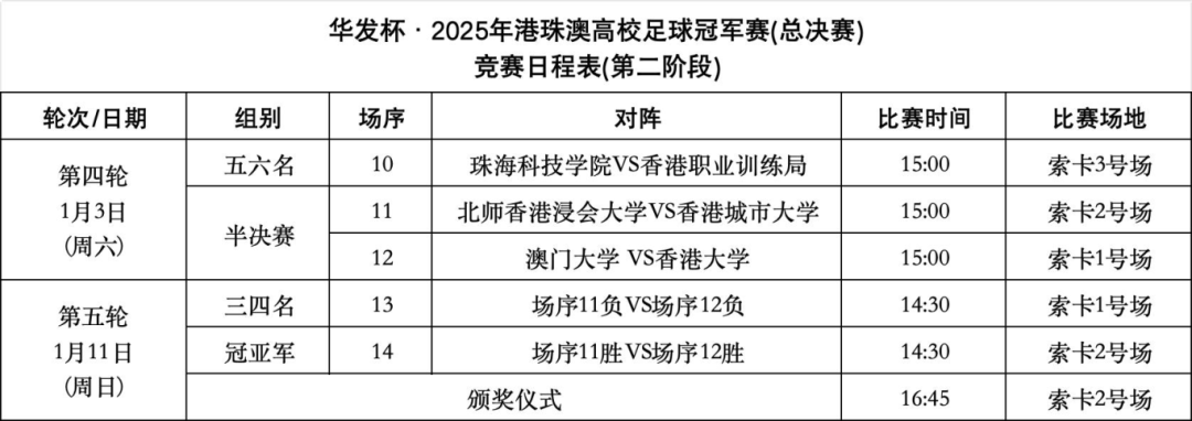 以球会友,传递拼搏精神,共筑友谊桥梁。“华发杯・2025港珠澳高校足球冠军赛”第二阶段赛事即将开启!单场决胜的紧张节奏、强强对决的精彩碰撞、冠军荣誉的终极角逐都将在2026年1月逐一上演。其中,澳门大学、北师香港浸会大学、香港城市大学、香港大学、珠海科技学院、香港职业训练局6支代表队将于2026年1月3日在珠海索卡体育训练基地开展对决!