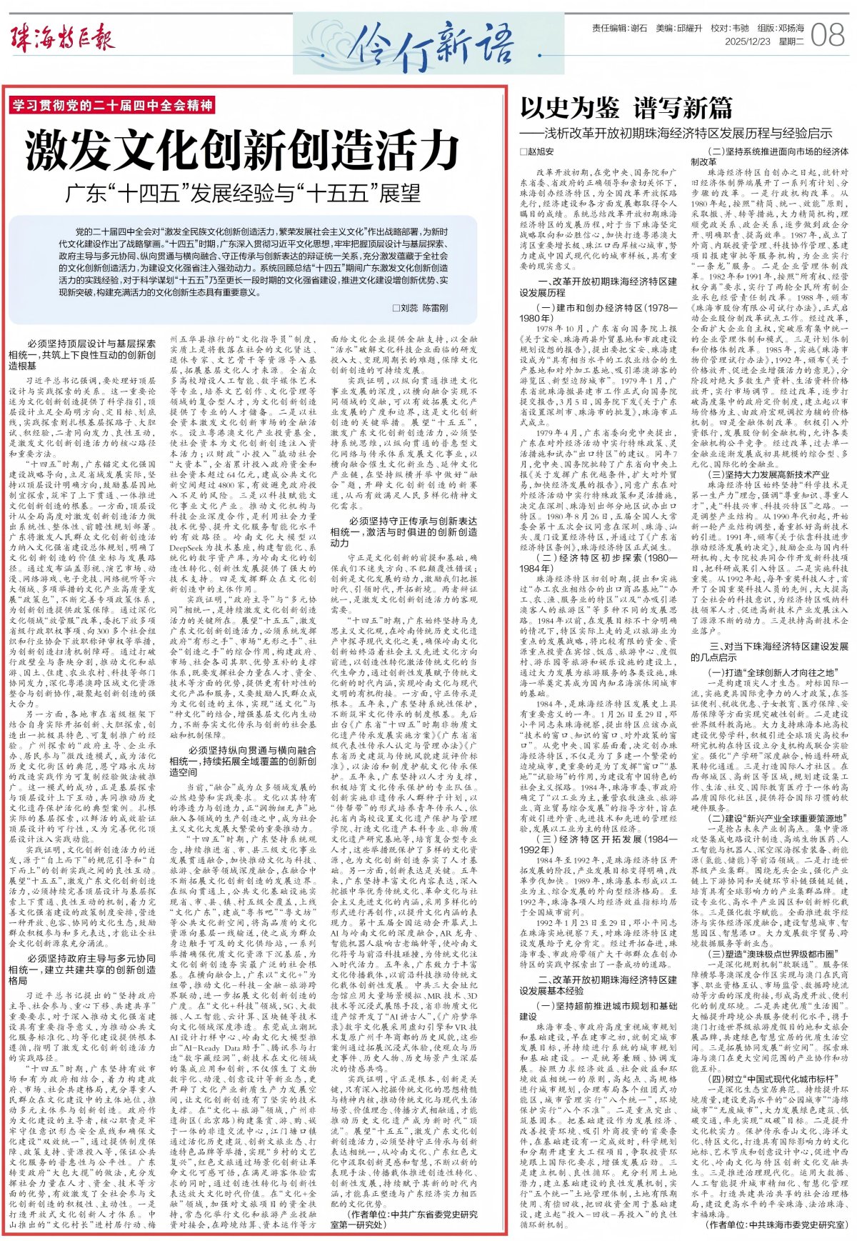 实践证明,守正是根本,创新是关键,只有深入挖掘传统文化的思想精髓与精神内核,推动传统文化与现代生活场景、价值理念、传播方式相融通,才能推动历史文化遗产成为新时代“顶流”。展望“十五五”,激发广东文化创新创造活力,必须坚持守正传承与创新表达相统一,从岭南文化、广东红色文化中汲取创新灵感和智慧,不断以新的表现手法、传播载体推进创造性转化、创新性发展,持续赋予其新的时代内涵,才能真正塑造与广东经济实力相匹配的文化优势。