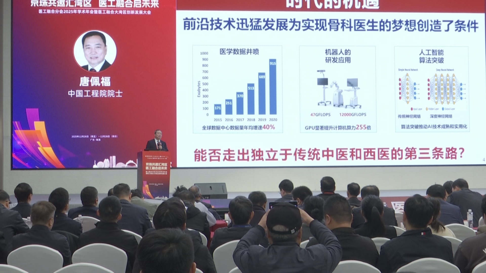 严重骨创伤修复重建如何实现精准治疗?转化医学如何通过多学科交叉推动临床应用落地?手术机器人未来将如何革新传统外科模式?在12月27日举行的医工融合分会2025年学术年会暨医工融合大湾区创新发展大会上,以唐佩福院士、樊春海院士为代表的全国近300位顶尖学者、临床专家、产业界代表共聚珠海,深入探讨以跨界融合驱动健康产业创新与变革的发展路径。