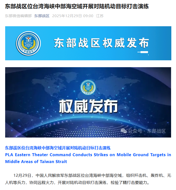 东部战区位台湾海峡中部海空域开展对陆机动目标打击演练