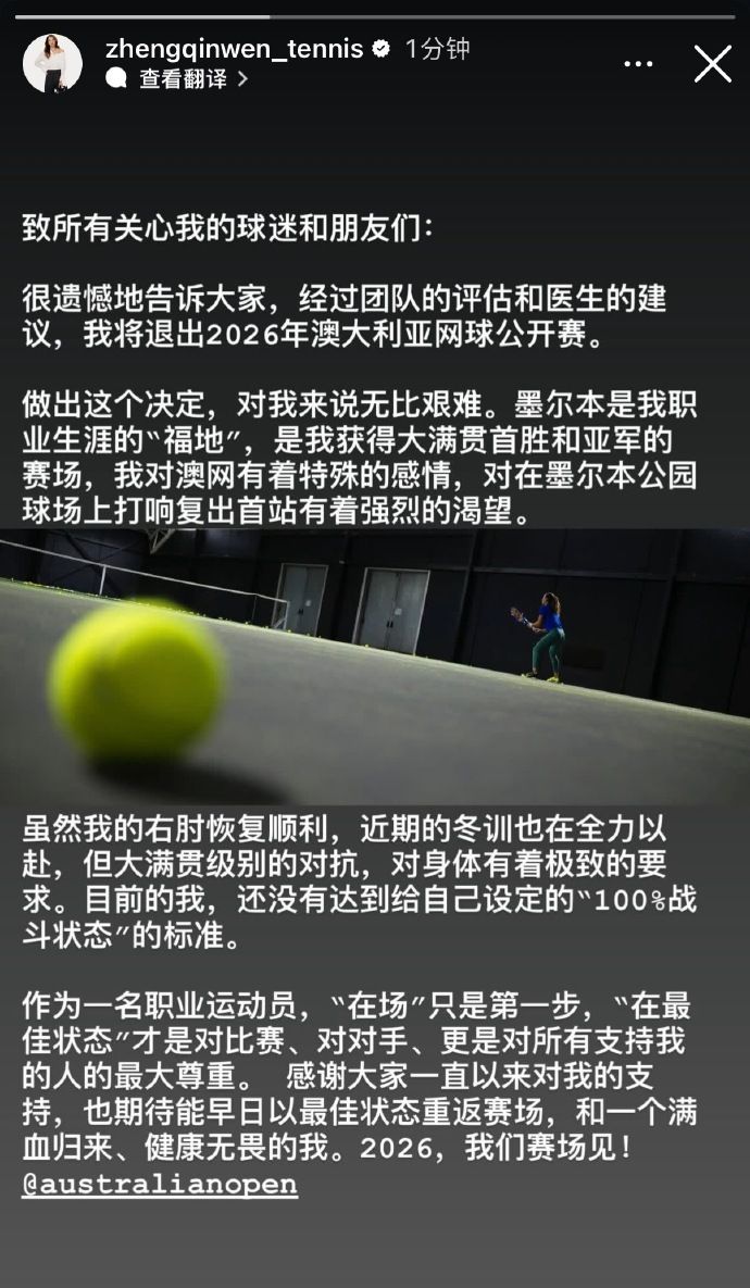 郑钦文退出2026年澳大利亚网球公开赛