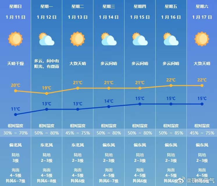 预计11日珠海市维持天晴干燥天气,昼夜温差大,早晚寒冷;12日起云量有所增多,以多云间晴天气为主,气温逐渐回升。温馨提示:天气持续干燥,请注意防火和用火用电安全。
