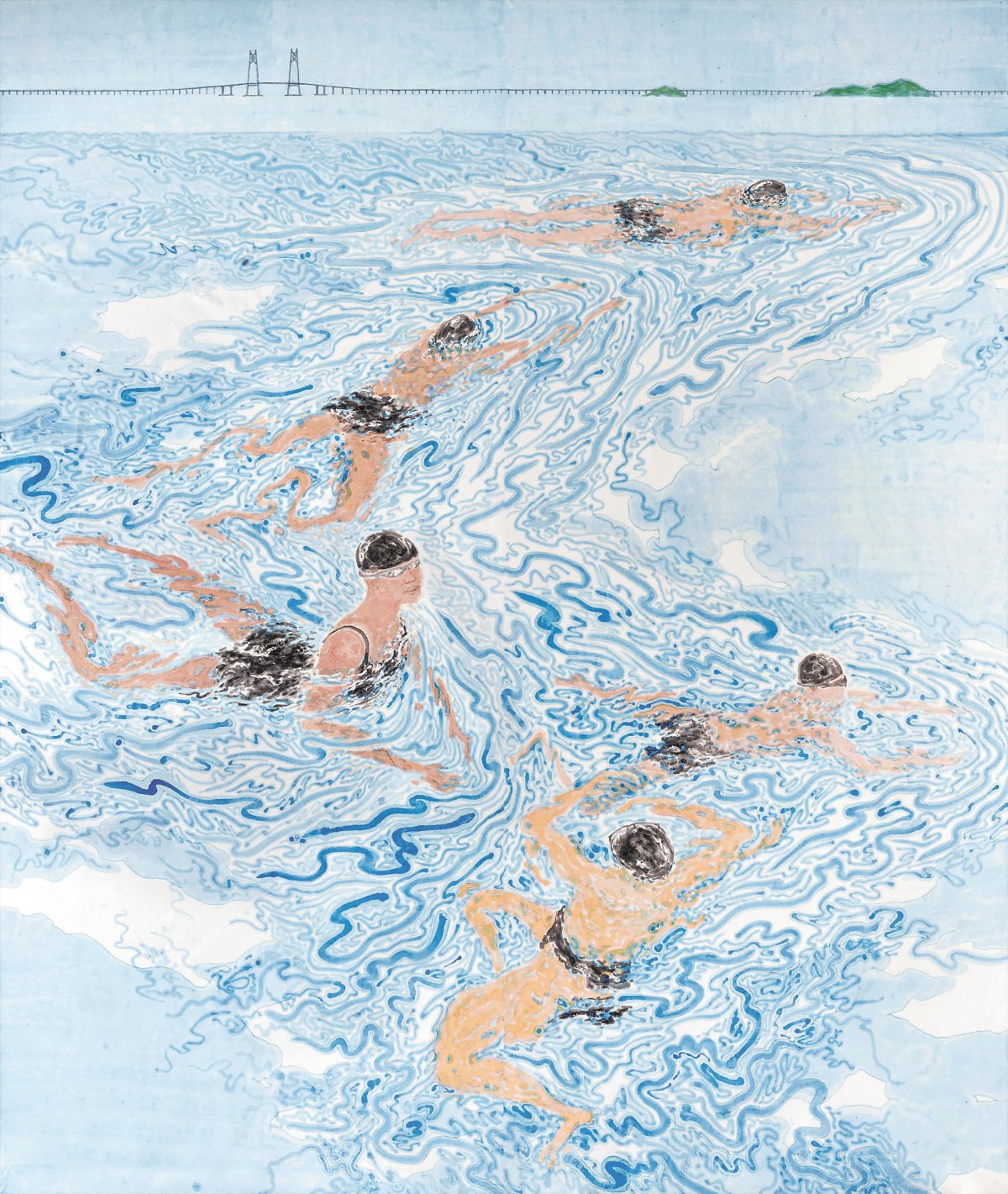 在中国画领域,林洋的探索同样值得关注。他没有停留在传统的既定框架内,而是在尊重笔墨精神的基础上,引入当代视觉经验和跨文化元素。他的国画作品既有传统的笔情墨趣,又有现代生活的温度与节奏,在游泳系列作品中,明显地将传统的笔墨意韵与现代审美观念并置,创造了一种时间错位的视觉体验,暗示传统与现代之间复杂而微妙的关系。