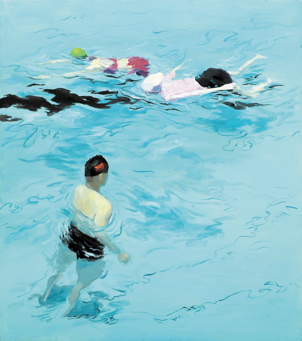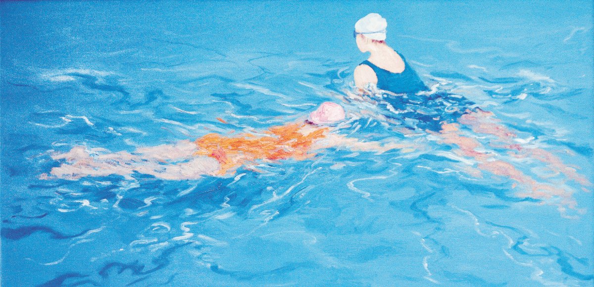 游泳这一题材的选择本身具有象征意义。水,在中国传统文化中既是生命之源,也象征着变化与流动;在当代语境中,游泳池则成为现代性的隐喻——规整、受控却又充满不确定性。我想,林洋这些年通过游泳系列,在探讨个体规则与自由、束缚与解放之间的关系,这种探讨已经超越了单纯的视觉表达,触及人的生存状态。2021年入选“新时代・新使命・新征程奋进粤港澳大湾区——全国中国画、油画作品展”的《幸福时光》以及2024年入选“精神・图式——第三届中国写意油画双年展”的《游于艺之擦肩而过》作品中,更将这种探讨延伸至集体记忆领域,暗示个体在集体中的位置与自我认同的寻求。这种暗示与跨艺术门类的实践不是简单的题材重复,而是对同一主题的重新解读与再创造,体现了林洋对艺术本质的深层思考。