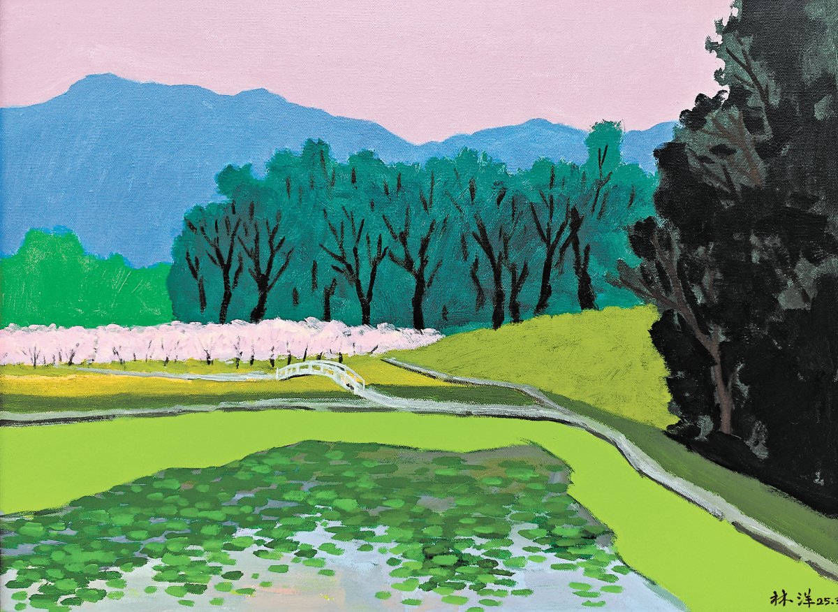 在油画当代方式的探索中,林洋表现出更为大胆的精神。古典油画如同一扇窗户,画家以透视学、解剖学、光影法则为榫卯,竭力在二维平面上营造三维空间的“真实性”。而当代油画的当代方式,恰恰是对这扇“窗”的拆解,其核心便是平面视觉的自觉重构。画家可以任意改变空间的前后关系,可以采用多个视点,可以使画面中心偏移,可以对形与色进行分割和重组。林洋在其《陕北印象・之五》《淇澳烟雨》《庐山松露》《静静的港湾》《远望》等写生作品中,深度空间被压缩、摒弃。形象也不再按远近比例缩小,色彩也不再依空气透视明显渐变,他巧妙地利用色彩规律主观地重构画面,平涂的色域不仅是背景,更是情绪本身的彰显。这种当代方式可以成为林洋直接直面材料,探索视觉语言边界,进行哲学上社会思考的自主场域,并获得属于这个时代的不断自我刷新的“当代方式”。