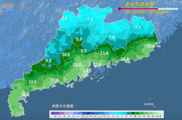 广东最低气温预报。具体天气预报显示为,13日,全省大部多云到晴天,粤西市县早晚有(轻)雾。最低气温:粤北市县5-8℃,南部沿海市县13-15℃,其余市县9-12℃。