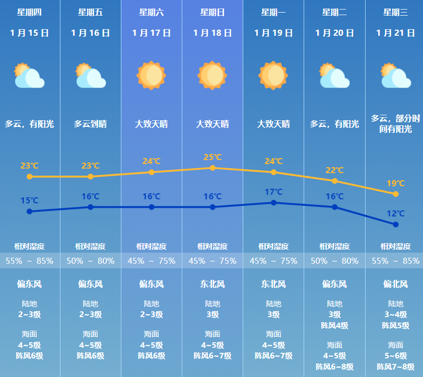15日,南部沿海市县多云间阴天,其中粤东沿海市县有分散性零星小雨,其余大部市县晴天间多云。西江流域和粤西市县早晚有(轻)雾。最低气温:粤北市县7℃~9℃,南部沿海市县13℃~15℃,其余市县10℃~12℃。