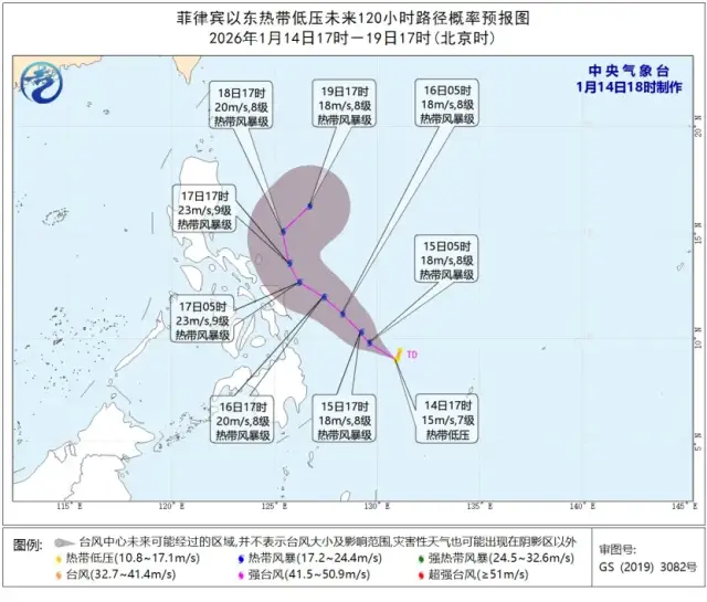 菲律宾以东洋面热带低压的中心14日下午5点钟位于菲律宾马尼拉东偏南方向约1250公里。预计,该低压将以每小时15公里左右的速度向西北方向移动,强度逐渐增强,可能于未来24小时内加强为今年第1号台风,最强可达热带风暴级(18-23米/秒,8-9级),对广东省海面无直接影响。