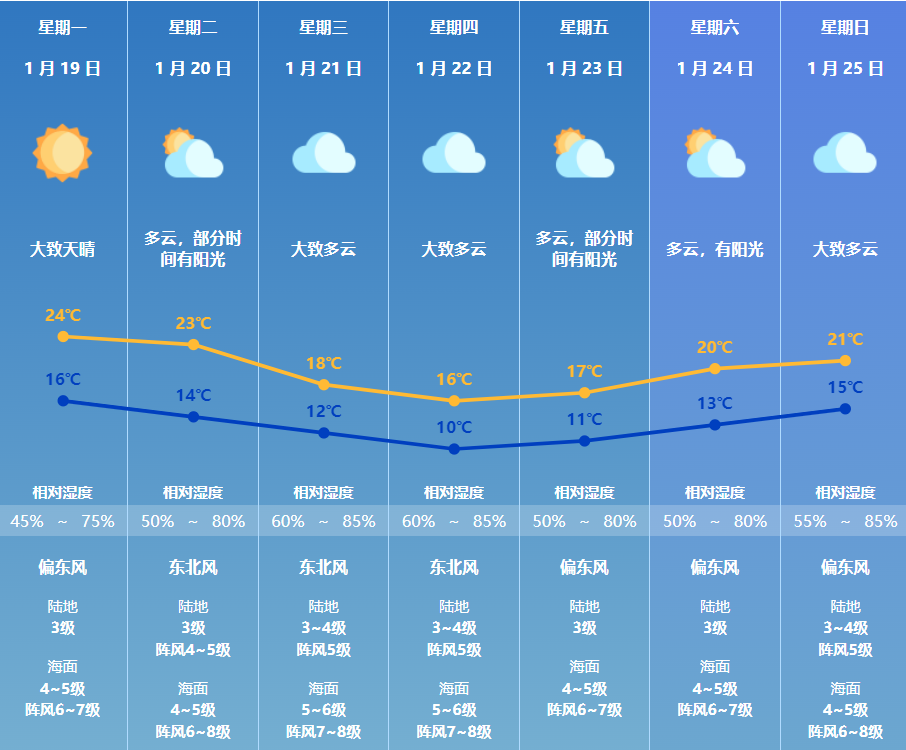 珠海方面,预计19-20日晴到多云,日间温暖;21-23日受冷空气影响,气温下降,早晚寒凉,海面风力加大。