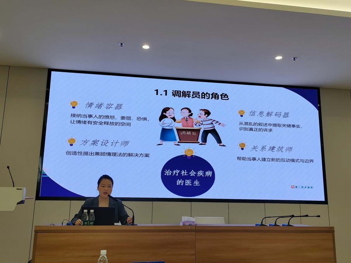 分享会采用“专题讲座+案例剖析+互动交流”的模式,兼顾法律理论深度与实务操作温度。在专题讲座环节,全国首届婚姻家庭纠纷人民调解工作“大比武”总决赛个人一等奖获得者欧阳青辰律师,围绕《民法典》婚姻家庭编及相关司法解释,结合多年执业经验,深入分析了新时代背景下婚姻家庭纠纷的新特征、新趋势。她系统解读了婚姻家庭纠纷调解的法律边界、法定程序及合规要求,并通过调解模型拆解,生动演示了情绪疏导、利益平衡、证据固定等实用技巧,强调调解工作既要“依法依规”,更要“用情用心”,让在场调解员深受启发。