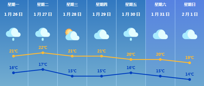 珠海天气:预计25日夜间至27日受东南气流影响,我市云量增多,湿度加大,间中有小雨,早晚有轻雾或雾;28-29日多云为主,气温略降。