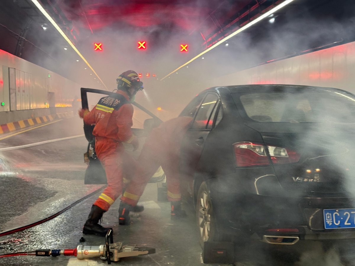 下午3时06分,随着一声警报响起,珠海隧道南线RK3+660米处(西往东方向)冒气滚滚浓烟,演练正式拉开序幕。根据演练脚本设定,一辆小轿车因追尾变形,司机被困车内,车头燃起浓烟,隧道内滞留车辆和人员面临火灾威胁。