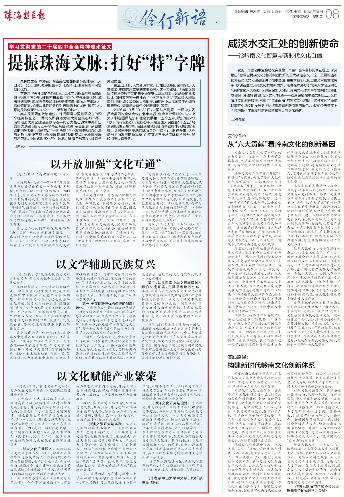 2025年10月20-23日,中国共产党第二十届中央委员会第四次全体会议在北京举行,全会审议通过《中共中央关于制定国民经济和社会发展第十五个五年规划的建议》(以下简称《建议》)。《建议》不只是全国人民直面“十五五”规划实施的行动纲领,而且还是我们各项事业具体开展的指南针。身居南中国要地的珠海自然当仁不让,继往开来,认真谱写全面发展的新篇章,而本文则主要从文脉视角展开,抛砖引玉以待来者。